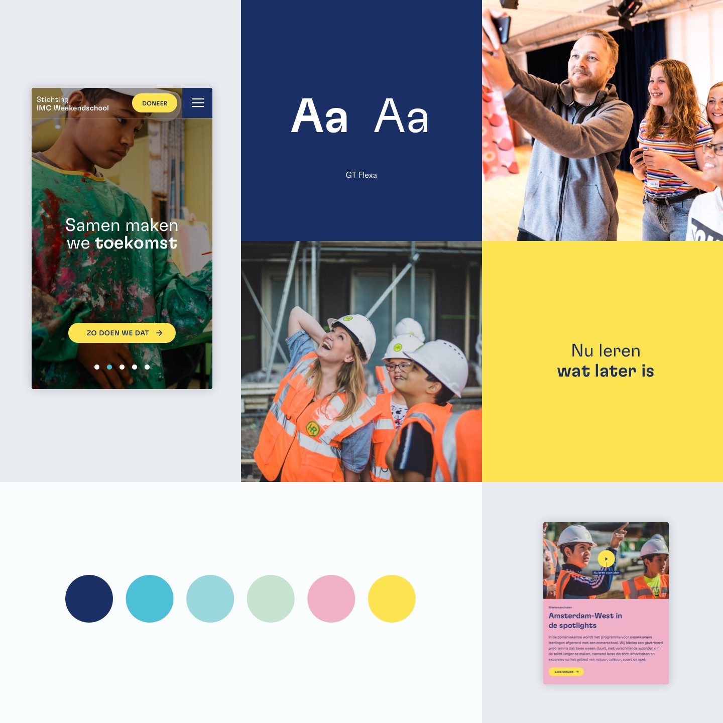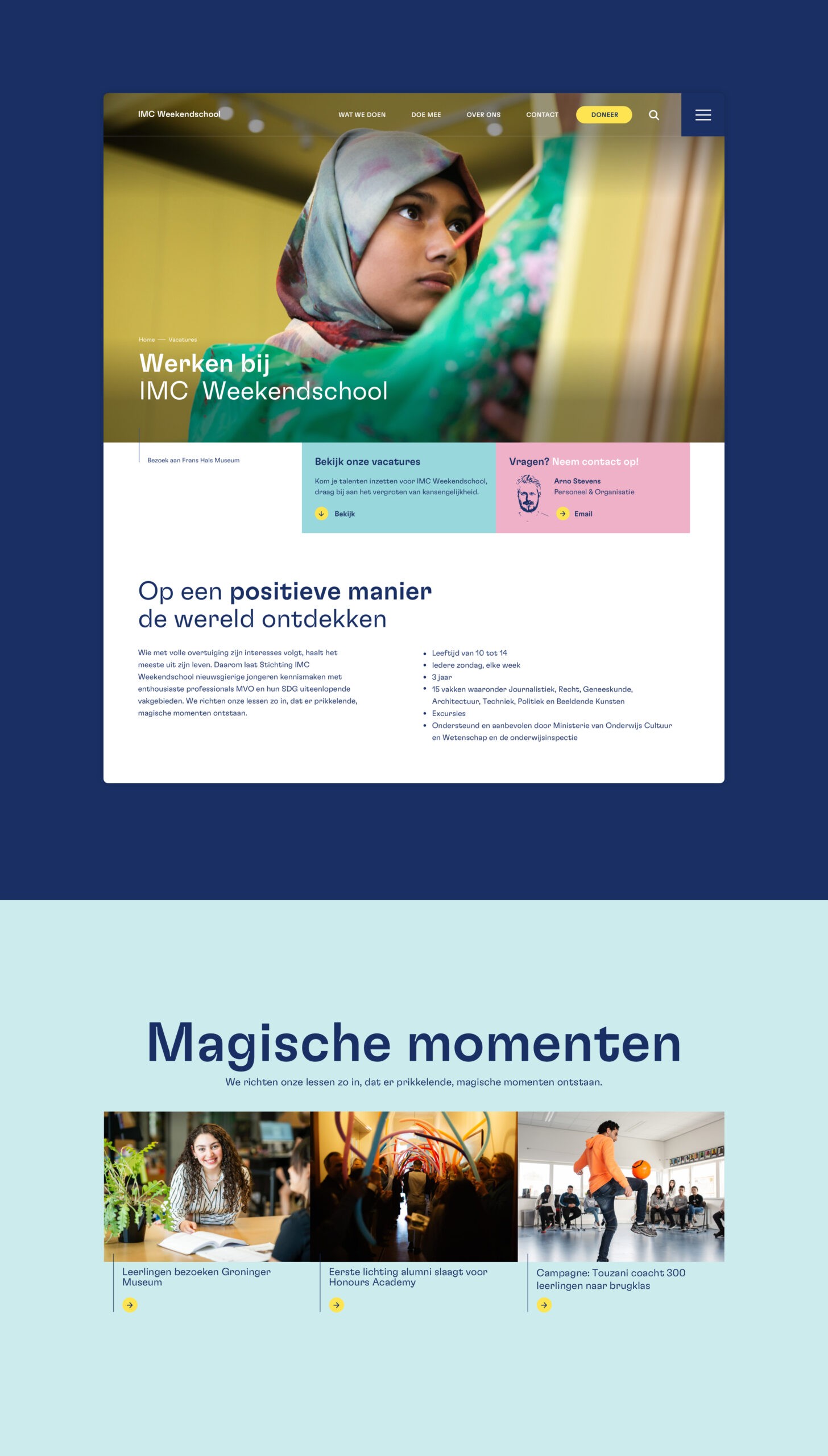 Om de energie van de leerlingen te versterken is de huisstijl verrijkt met nieuwe frisse kleuren en een modern lettertype. Dankzij intuïtieve navigatie zijn de vele verschillende doelgroepen binnen 1 à 2 klikken op de gewenste plek. Samen met IMC Weekendschool ontwikkelde we een rijke gevarieerde set aan bouwstenen waarmee ze in toekomst zelf pagina’s kunnen maken.